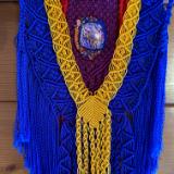Total size is 26 x 33 and the macrame size is 12 x 25 and is made of nylon cord. . All of my macrame hangings are done on driftwood from Whidbey Island in Washington State. I use nylon and cotton cord, but like the nylon best because of the color range.
