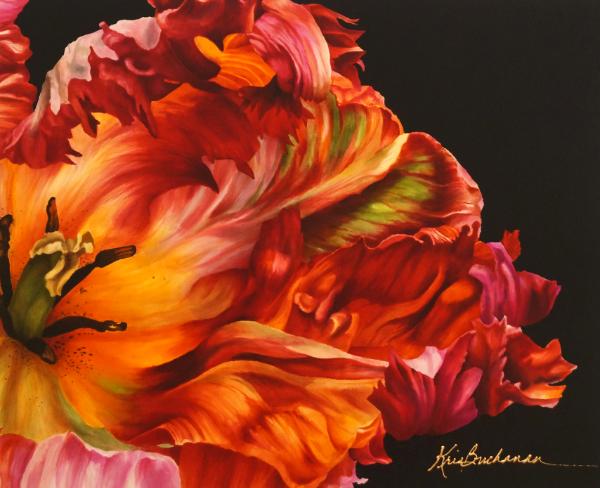 The photo for this painting was taken by Master Silk Painter Karen Sistek’s mother…Jane, thus the title. was I painted this tulip on 16mm Habotai silk with Jacquard (Red Label). I love Parrot Tulips with all their freeform petals. I also love orange. Mounted on 20 x 30 canvas.