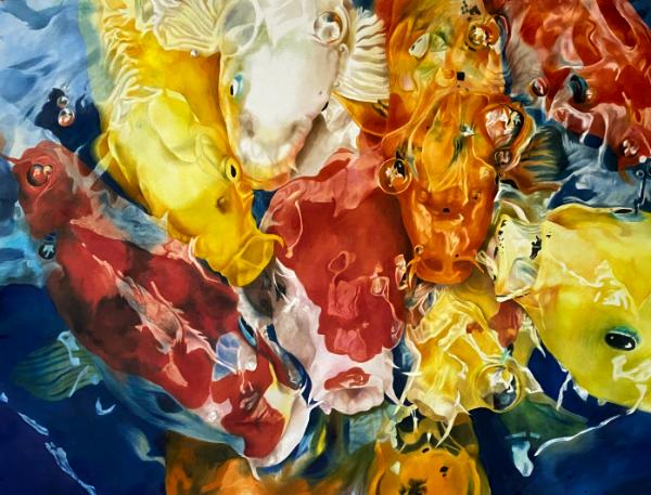 This is my 1st Koi painting on silk. I can get more detail using dyes on silk, therefore it takes me longer to paint. The photo for this painting was taken by me. It is painted on 16mm Habotai silk with Jacquard and Dupont dyes and mounted on 25 x 30 canvas.