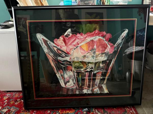 The light came in from my skylight and shone on my black countertop, on which I had an Orrefors crystal vase holding a rose. I grabbed my camera and took 5 different shots. I have painted 4 of the 5. This watercolor was painted on Arches 300# paper. It is framed, total size is 34 x 41.